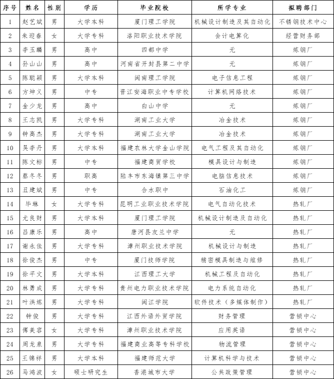 依據寶鋼德盛不銹鋼有限公司2023年招聘計劃,結合集團公司《陽光招聘具體操作指引》工作要求,通過個人自愿報名、資格復審、面試考評等環節,經集團公司審批通過,現將2023年社會招聘計劃第二批擬聘人員名單公示如下: