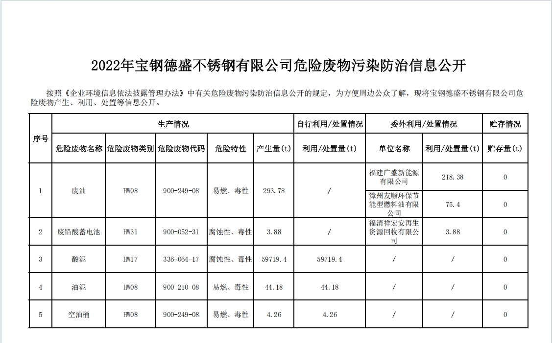 2022年寶鋼德盛不銹鋼有限公司危險(xiǎn)廢物污染防治信息公開(kāi)